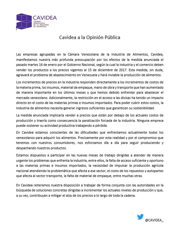Las empresas agrupadas en la Cámara Venezolana de la Industria de Alimentos, Cavidea, manifestamos nuestra más profunda preocupación por los efectos de la medida anunciada el pasado martes 16 de enero por el Gobierno Nacional, según la cual la industria y el comercio deben vender los productos a los precios vigentes al 15 de diciembre de 2017. Esta medida, sin duda, agravará el problema de abastecimiento en Venezuela y hará inviable la producción de alimentos.